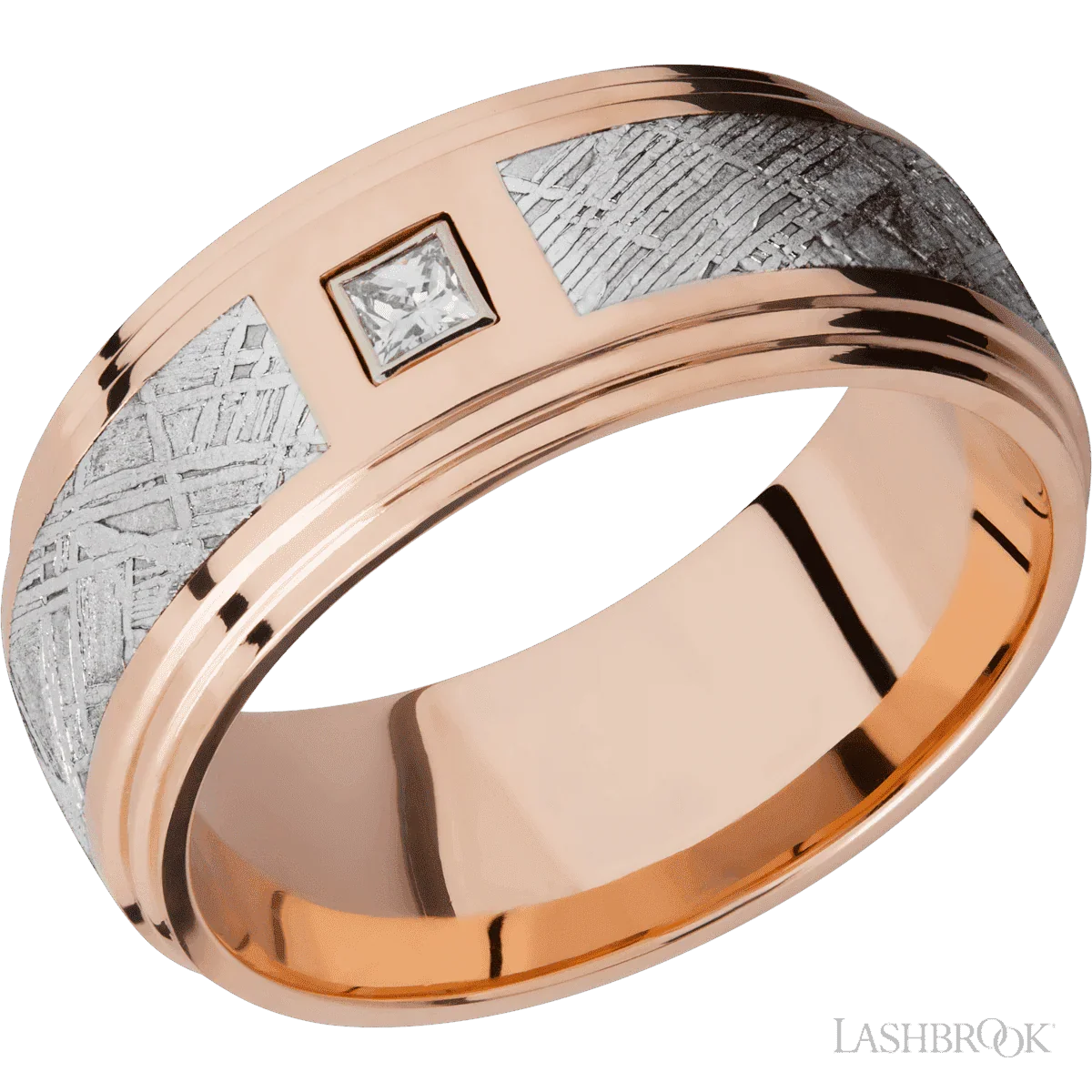 14K Rose Gold flat band with a double grooved edge, a meteorite inlay and a princess cut diamond - 9MM