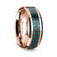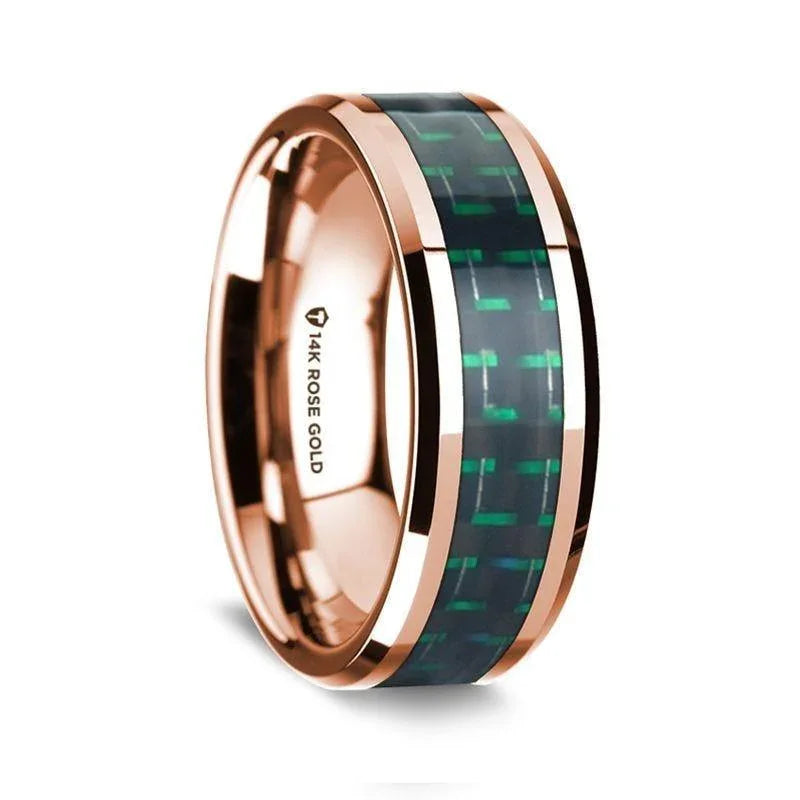14k Rose Gold Polished Beveled Edges Wedding Ring with Black and Green Carbon Fiber Inlay - 8 mm