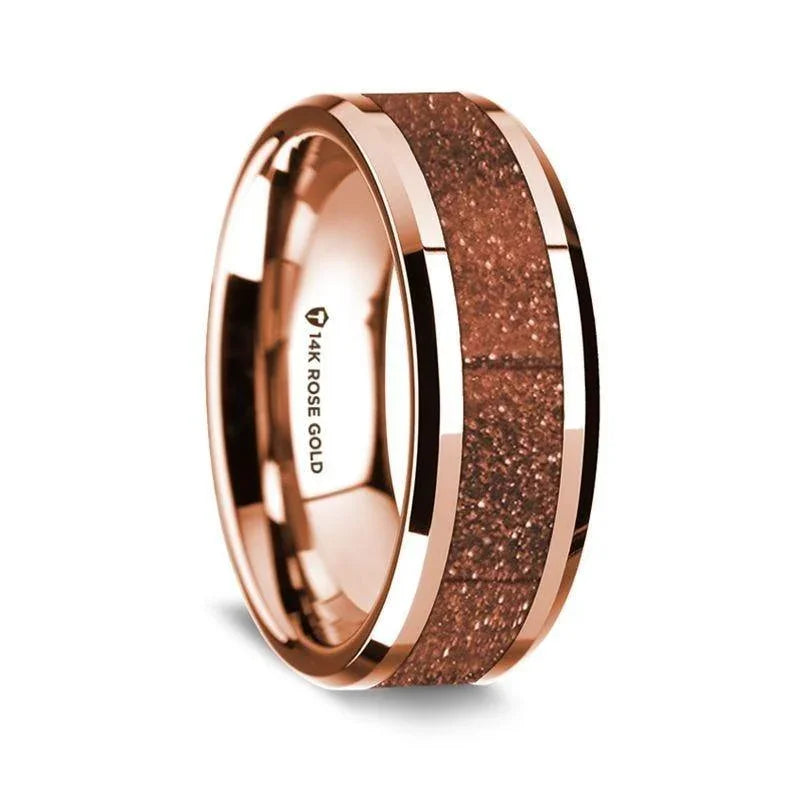 14K Rose Gold Polished Beveled Edges Wedding Ring with Orange Goldstone Inlay - 8 mm