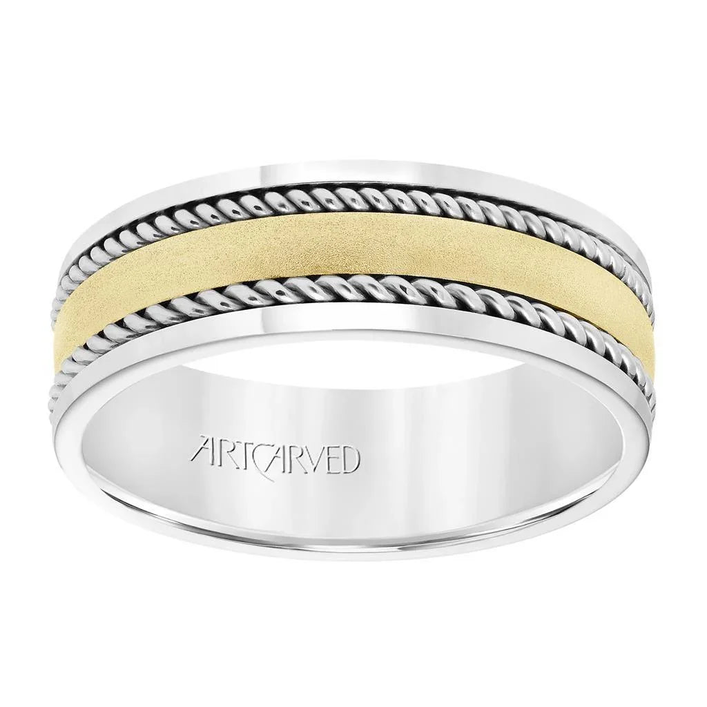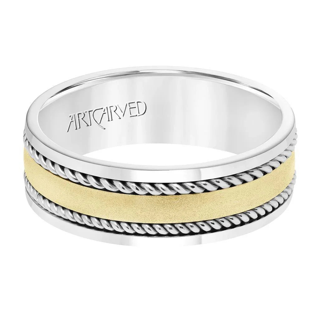 This is a brand new style from our large collection of Artcarved wedding bands. This is an amazing wedding band with a contemporary design featured in two toned 14k white gold with a 14k yellow gold center. This breathtaking design includes a center satin finish with dual rope accents around the edges. The 7 mm ring also includes high polished edges for a thoughtful touch. This style is ideal for anyone desiring a stylish modern look. Similar styles can be found under our tungsten wedding bands collection. This style is also available in a variety of other metals. All Artcarved Rings come with a lifetime warranty that covers resizing and/or replacement in case of accidental damage for a shipping, handling and processing fee.