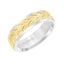 This is a modern wedding band featured in 14k white and 14k yellow gold. This design features a graceful yellow gold textured leaf center design complemented with high polished white gold round edges. This 6.5 mm width stylish design, is perfect for couples desiring a matching set. All Artcarved Rings come with a lifetime warranty that covers resizing and/or replacement in case of accidental damage for a shipping, handling and processing fee. You may also find similar ring styles under our tungsten wedding bands collection.