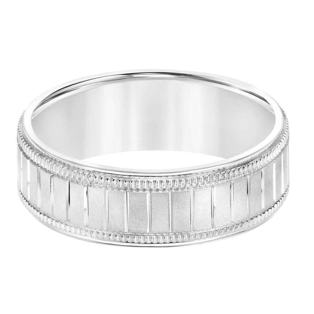 14k White Gold Men’s Milgrain Wedding Band with Polished Horizontal Grooves - 7mm