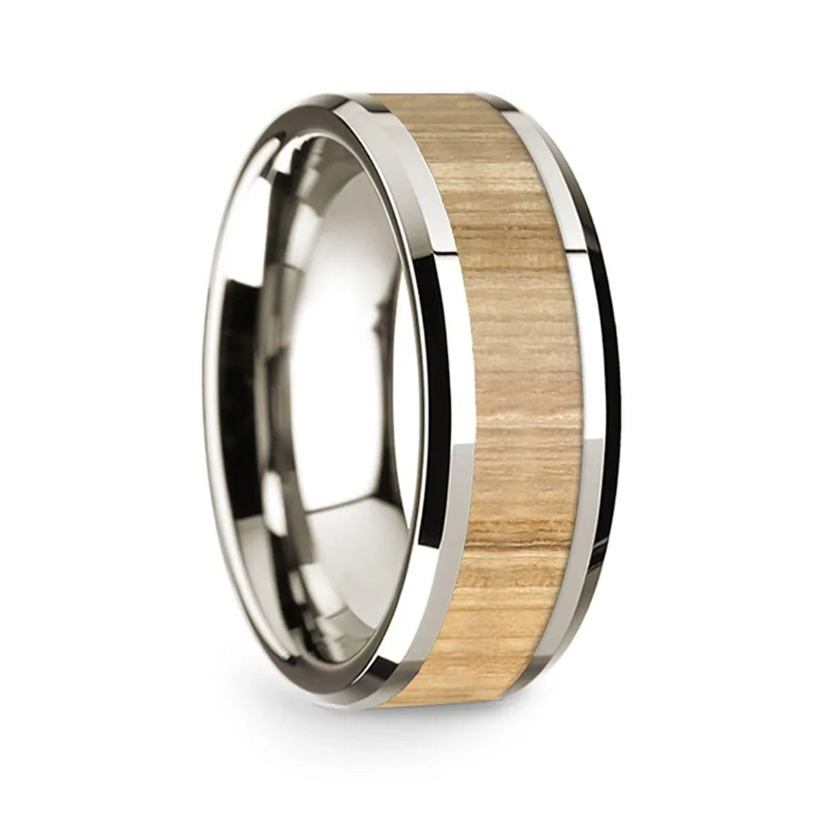 14k White Gold Polished Beveled Edges Wedding Ring with Ash Wood Inlay - 8 mm