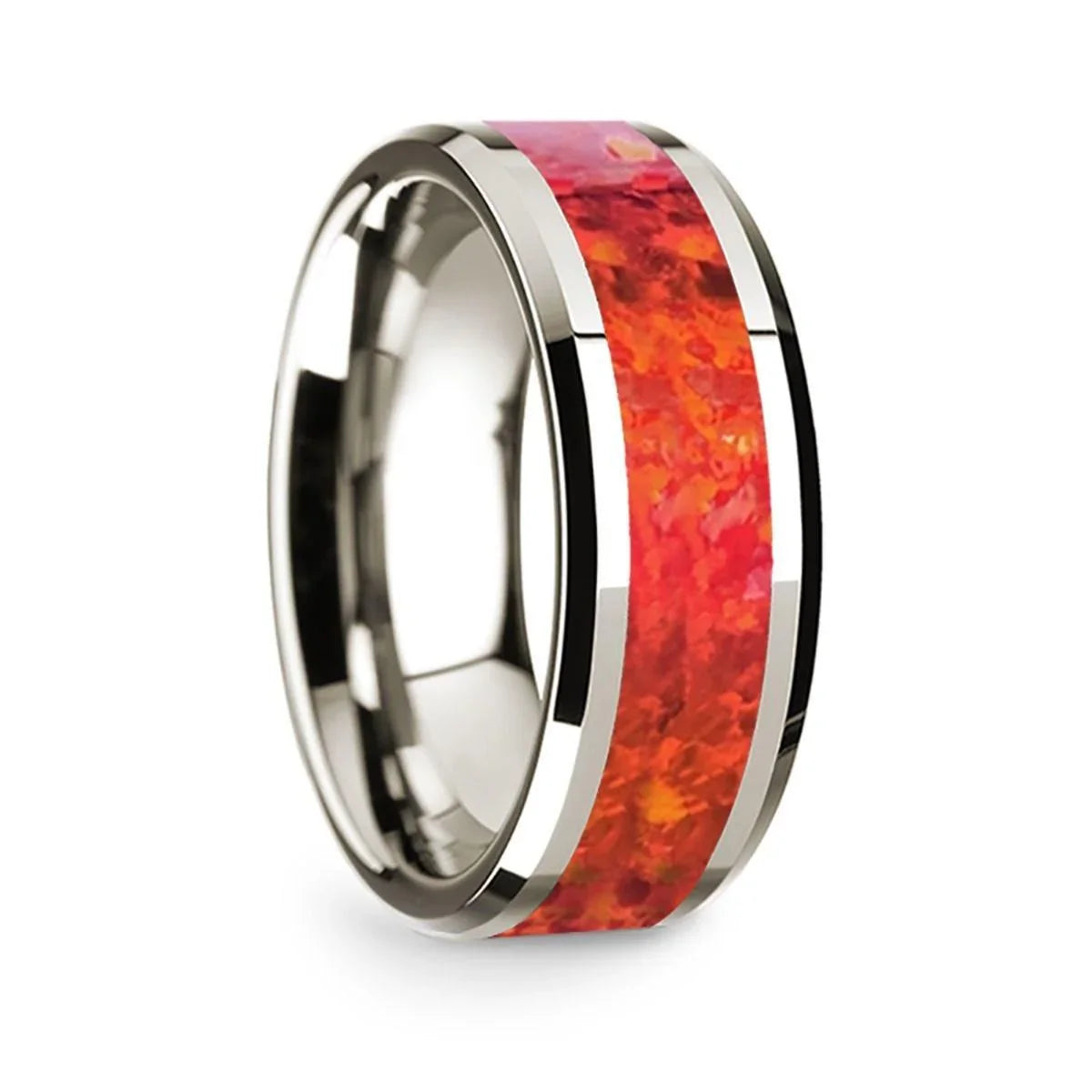 14k White Gold Polished Beveled Edges Wedding Ring with Red Opal Inlay - 8 mm