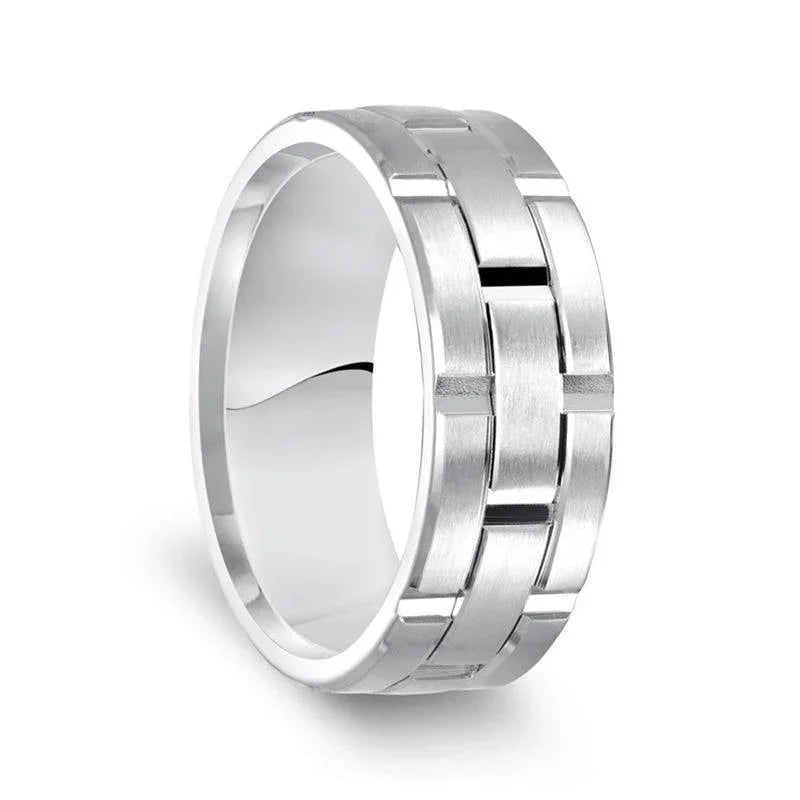 14k White Gold Satin Finished Men’s Wedding Ring with Vertical Grooves - 8mm