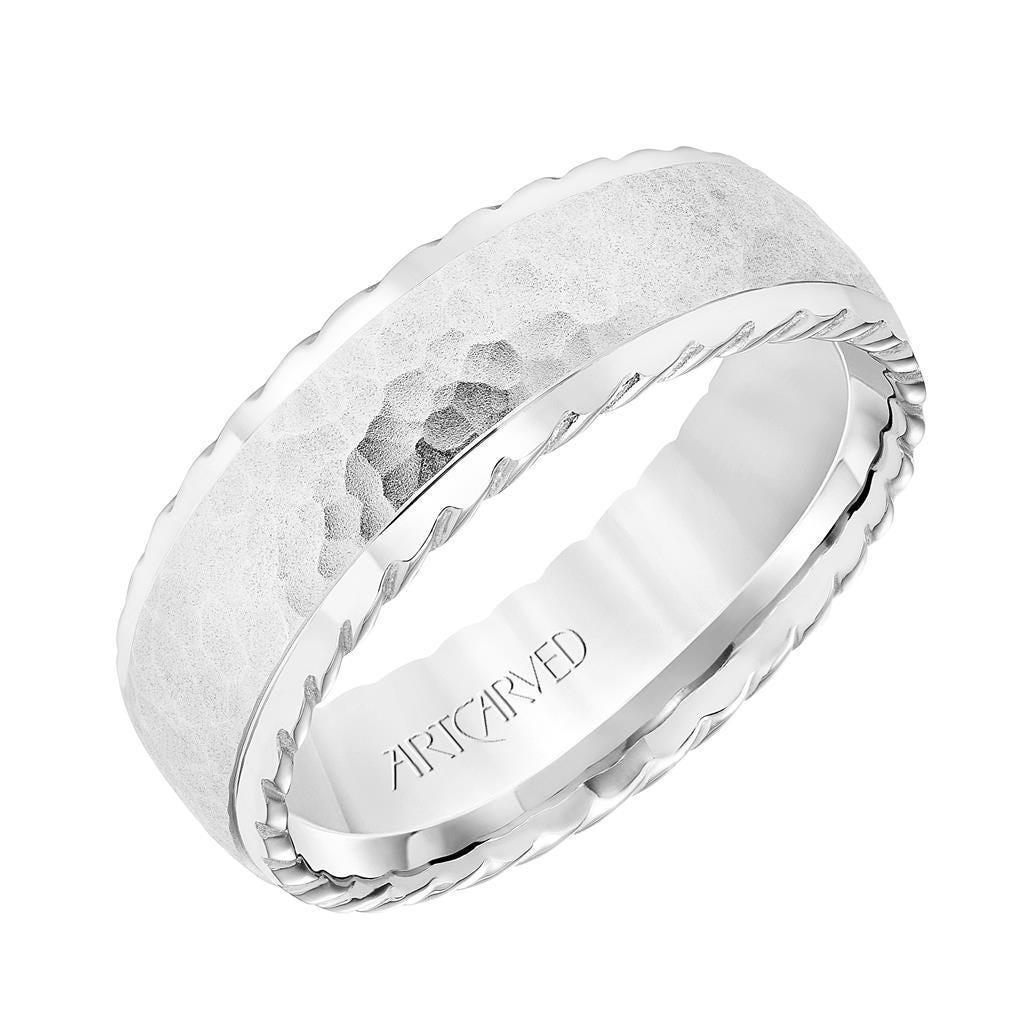 Here we have an edgy stylish wedding band crafted in 14k white gold. This design features a unique hammered texture for added interest. The ring's modern design also includes a touch of elegance with the the rope detail it has along the edges. The 7 mm band has both, style and sophistication, making this a great choice for any couple looking for a trendy modern wedding band set to represent their marriage commitment. This style is also available in a variety of other metals. Similar ring styles can be found under our tungsten wedding bands collection. All Artcarved Rings come with a lifetime warranty that covers resizing and/or replacement in case of accidental damage for a shipping, handling and processing fee.