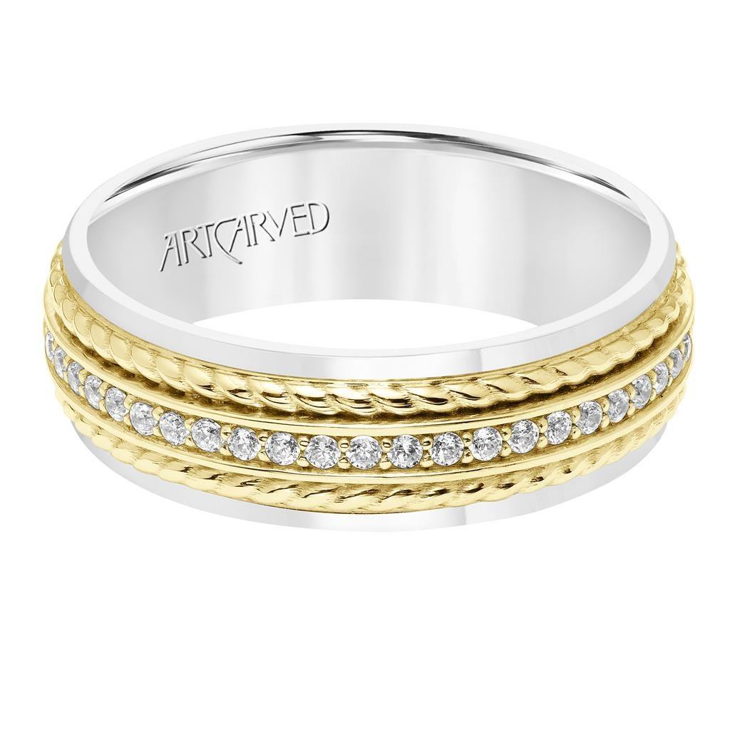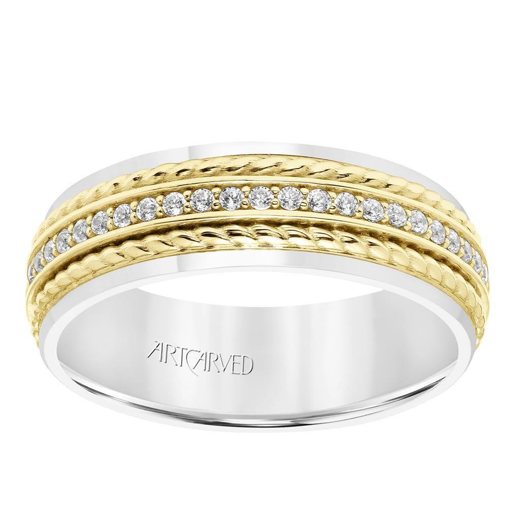 This is a unique two toned wedding band featured in 14k white and 14k yellow gold. This excellent design has been artfully crafted featuring a double rope and diamond center. It includes 48 white round cut dazzling diamonds all across the band for added sophistication. Each diamond has a weight of 0.010 for a total carat weight of 0.480. This 7 mm band is the perfect wedding band if you would like to symbolize your marriage commitment with a modern style. The diamonds come in the color grade H-I with a clarity of SI2. All Artcarved Rings come with a lifetime warranty that covers resizing and/or replacement in case of accidental damage for a shipping, handling and processing fee.