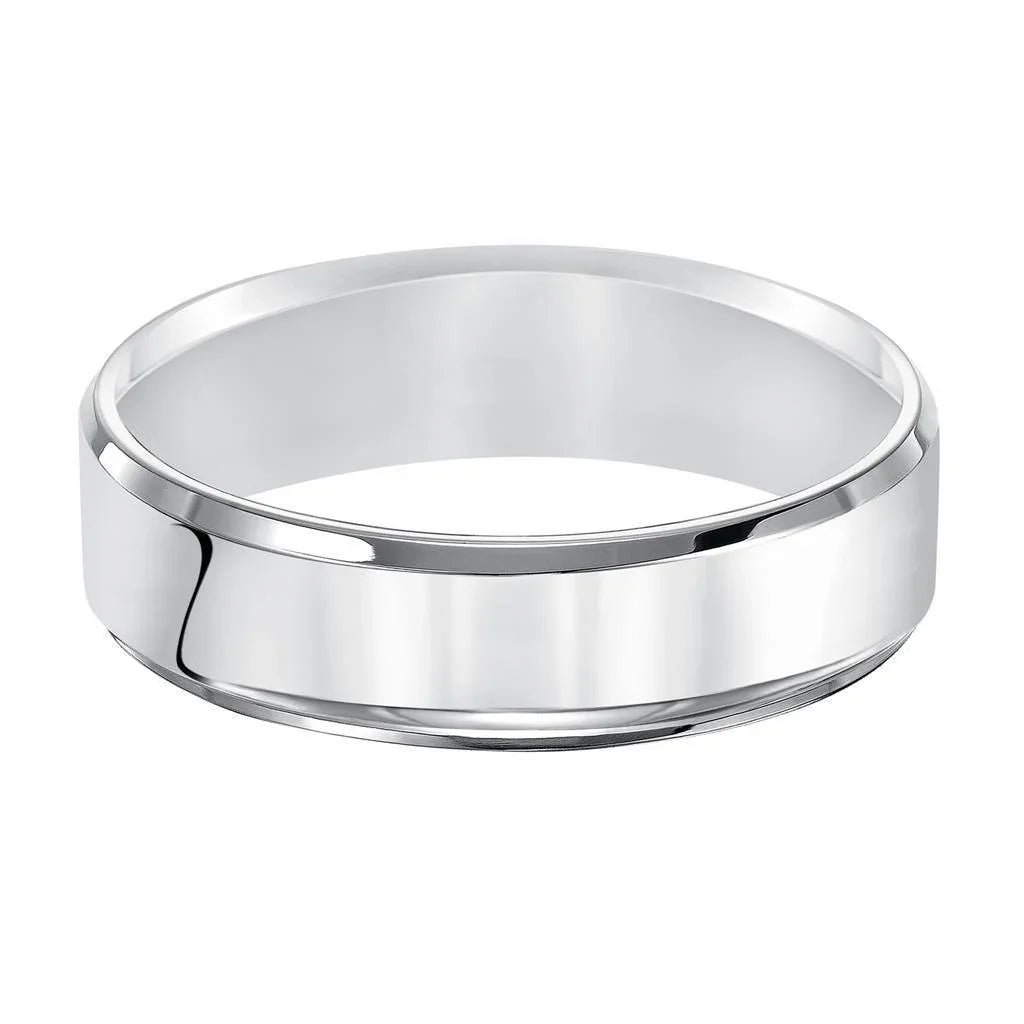 Here we have an impressive modern wedding band in 14k white gold. This simple and sleek design features a high polished finish and beveled edges for added comfort. This ring is available in 3mm, 4mm, 5mm, 6mm, 7mm, and 8mm. This design is the perfect choice for men and women who desire a simple traditional wedding band with a touch of elegance. This style is also available in a variety of other metals. You may also find similar styles under our tungsten wedding bands collection.