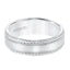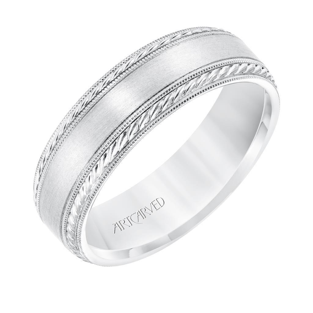 This is a luxurious traditional wedding band featured in classic 14k white gold. This style has been delicately crafted to feature a satin center finish with beautiful milgrain rope accents along the edges for the perfect final touch. This 6.5 mm width band is a great option for men and women to represent eternal love commitment. This style is also available in a variety of other metals. Similar ring styles can be found under our tungsten wedding bands collection. All Artcarved Rings come with a lifetime warranty that covers resizing and/or replacement in case of accidental damage for a shipping, handling and processing fee.