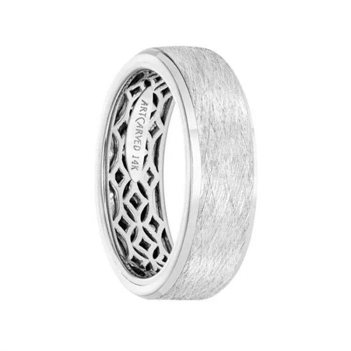 14k White Gold Wedding Band Geometric Inner Design Flat Wire Finish Beveled Edges by Artcarved - 7 mm