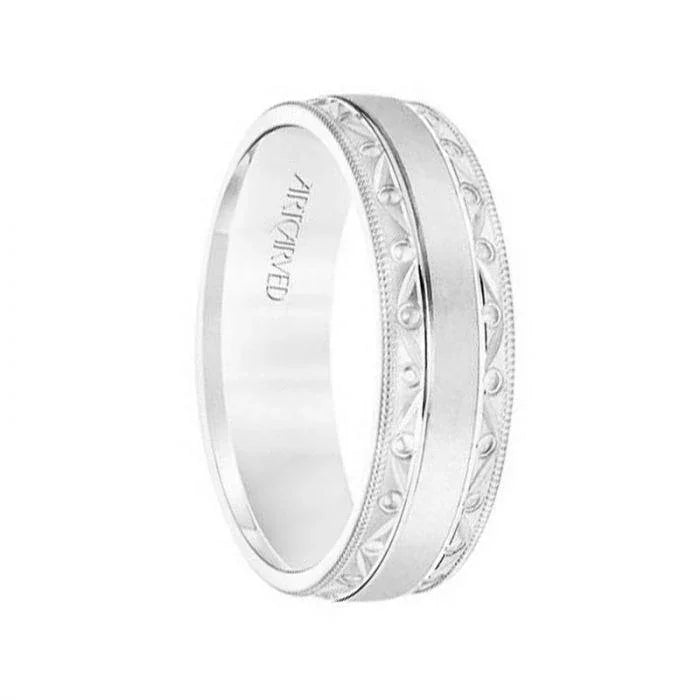 14k White Gold Wedding Band Vintage Textural Design Finish with Intricate Milgrain Edges- 6.5 mm