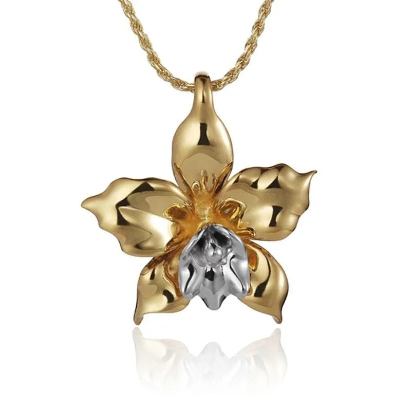 This necklace proudly displays a 14k yellow gold orchid pendant. The center of the orchid Pendantis accented by a sterling silver inlay. In addition to this gorgeous piece, the necklace comes with an 18" chain. This one of a kind necklace will make an excelled gift for the loved ones in your life.
