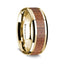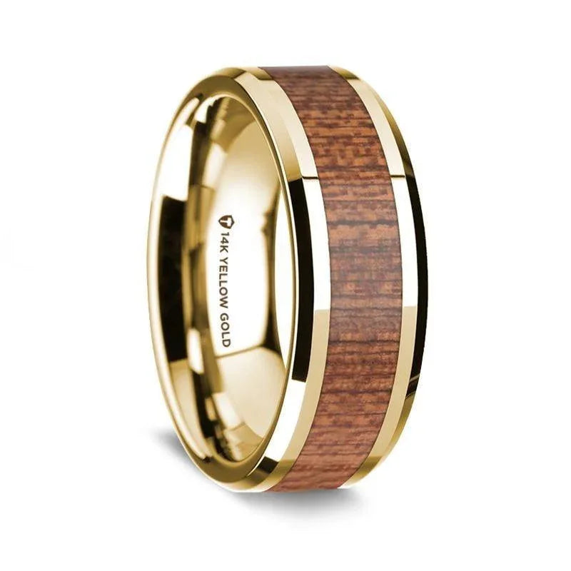 14K Yellow Gold Polished Beveled Edges Wedding Ring with Cherry Wood Inlay - 8 mm