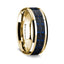 This wedding band features black and dark blue carbon fiber inlaid into the center of a 14K yellow gold wedding band with beveled polished edges. This comfort fit wedding ring is ideal to symbolize your love commitment and is available in an 8 mm width.