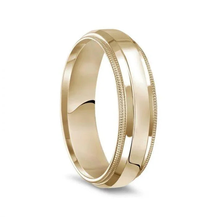 A dynamic polished finish contributes to the allure of this sensational low-domed ring. Fashioned in 14k yellow gold, this ring is ornately detailed with milgrain along both edges for additional edge. The raised center adds character and the inner band is rounded for comfort. This ring is available in 4mm and 6mm widths. It's also offered in a variety of metals. You may find rings similar to this style in our milgrain wedding bands collection. Larson Jewelers is proud to carry an assorted collection of 14k gold wedding bands. Gold is one of the most desired metals on the market and a traditional favorite for wedding jewelry. Our wedding bands are available in a variety of styles, widths and finishes, making them an excellent choice for both men and women.