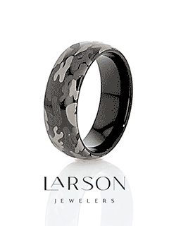 This awesome style from our tungsten wedding bands line incorporates the use of a grey and black camo pattern. This domed comfort fit wedding band is very unique in design. Universal Jewelry is proud to present our designer Tungsten Carbide Ring line by Thorsten.