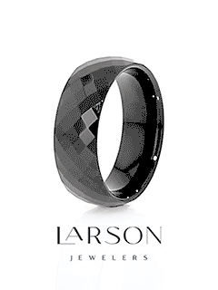 This Black Tungsten Carbide wedding band by Thorsten features 288 diamond shaped facets hand machined onto its surface and has been coated with a scratch resistant black ceramiclike plating giving it a beautiful onyx like color.