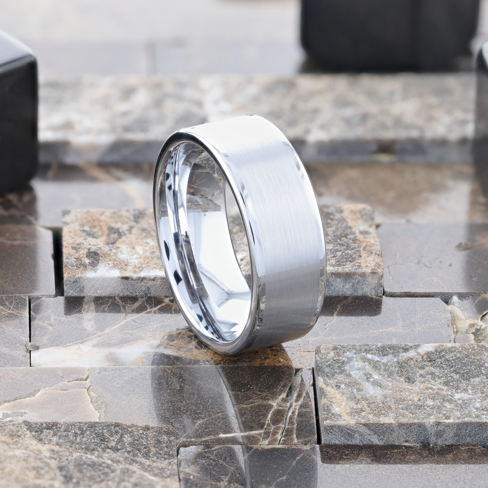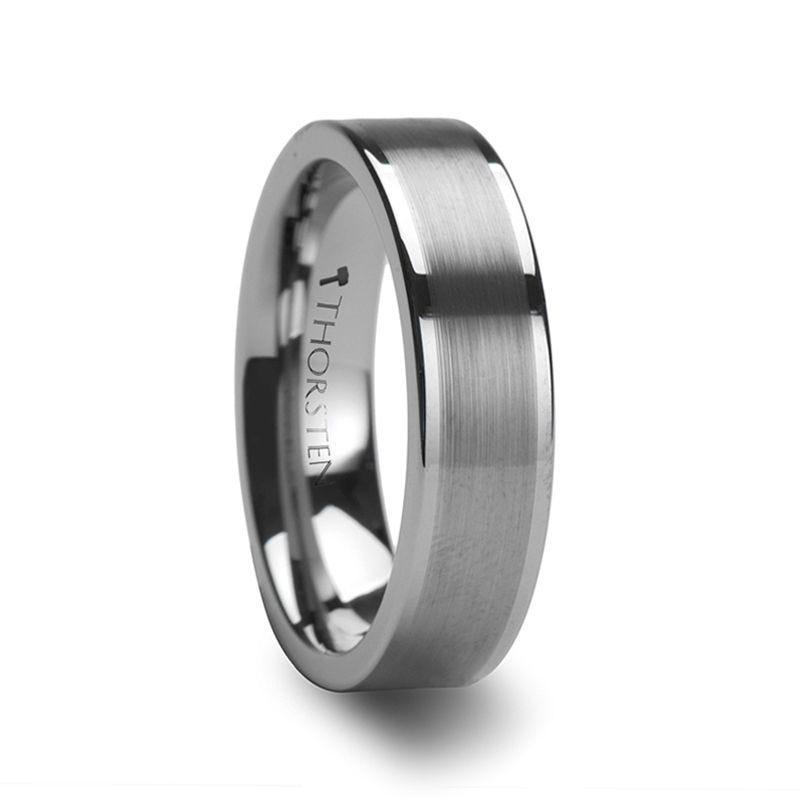 This classic flat-profiled Tungsten Carbide design gets a handsome makeover by Thorsten with its wide brush finish in the center of the ring while its polished edges catch the light and create a noteworthy contrast.