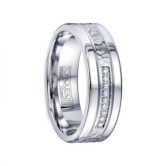 Hammered and Polished White Diamond Inlay Cobalt Flat Wedding Ring - 7mm