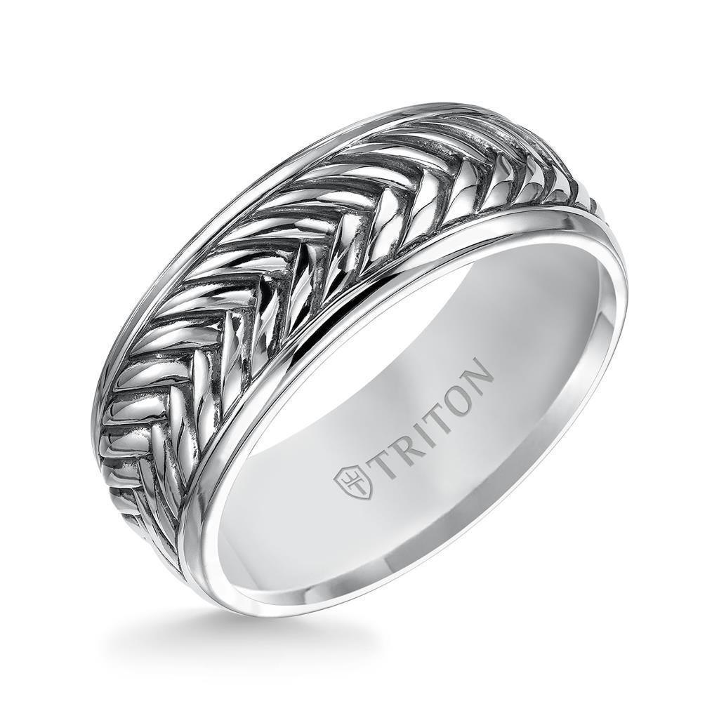- This 9mm Triton sterling silver wedding band features a gorgeous woven pattern with bright polished rims in an antique black oxidation finish. For the most amazingly intricate and beautiful designs in precious metal at an affordable price, express your stylish self with a stunning silver Triton ring. This is the perfect wedding ring to represent your love and commitment. Larson Jewelers is proud to be an authorized dealer of Triton Rings. Triton Rings is one of the most well known and respected designers of alternative wedding rings in the USA. All their rings come with a manufacturer's warranty that covers size exchanges for life, and repair or replacement in case of accidental damage. Note: There is a fee charged by Triton Rings, not us, for all warranty work to cover shipping and handling.