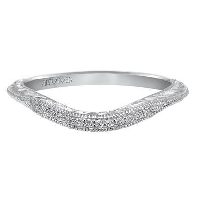 Add a touch of vintage charm to your special day with the Angel Vintage Diamond And Milgrain Engraved Wedding Band. Crafted in 18k white gold, its polished finish and intricate milgrain engraving create a timeless look. The inlay of sparkling diamonds adds a touch of elegance, making it the perfect complement to any wedding ensemble. From the trusted brand Artcarved.