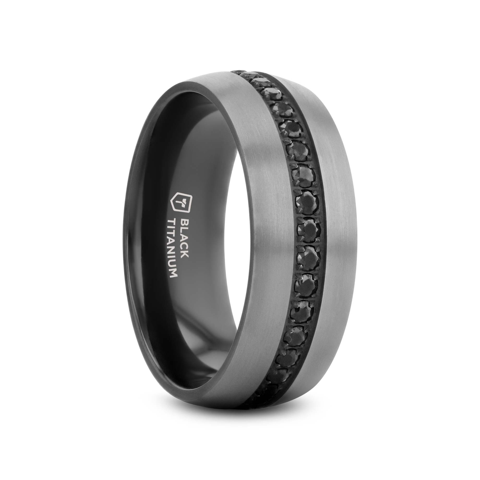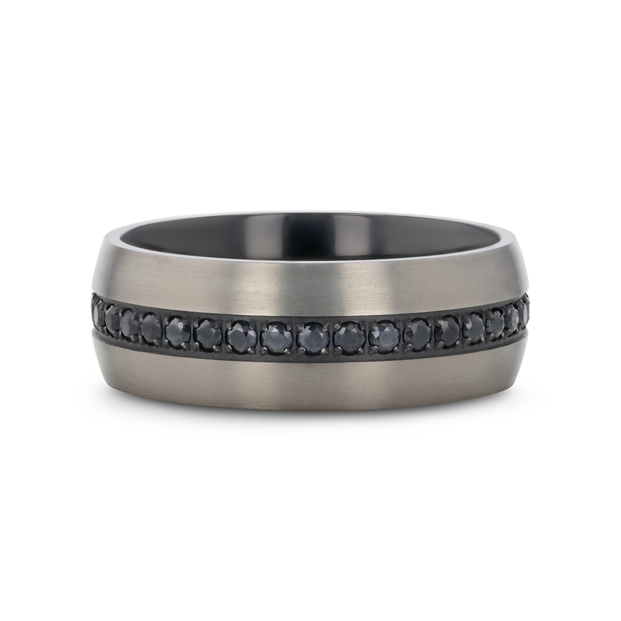 AVIATOR Domed Brushed Titanium Men's Wedding Band with Black Sapphire Stones Inlay - 8mm