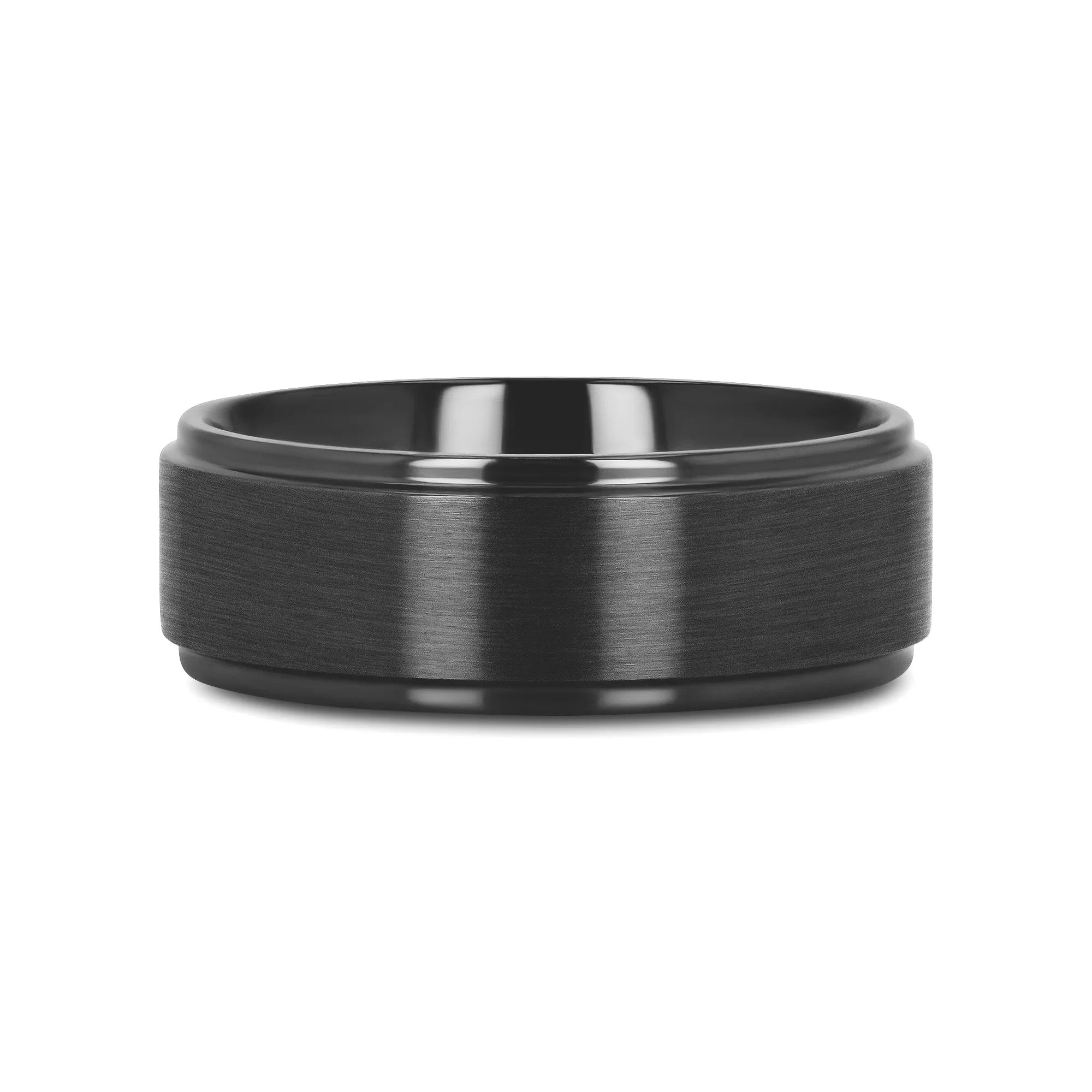 This style is a flat pipe-cut shape black titanium ring with a brush finished raised center with polished step edges as an attribute that brings out the center extremely well.