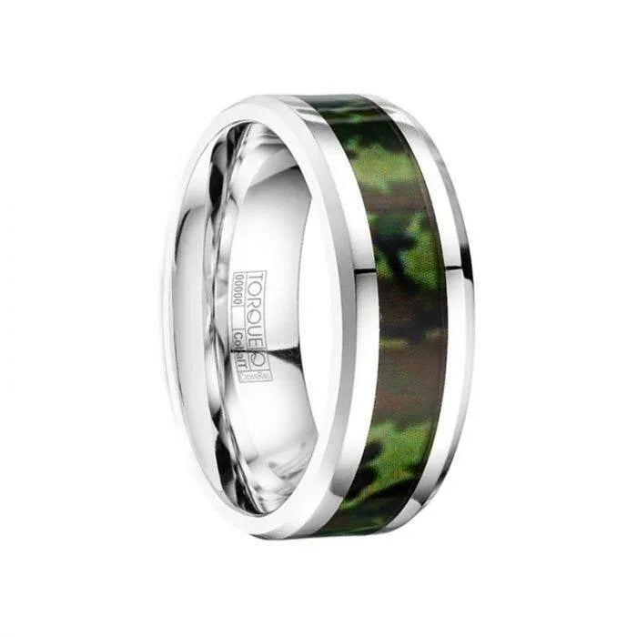 - Connect your love for outdoors with your love for your partner. This flat polished cobalt ring by Crown Ring is accentuated with green-brown camouflage pattern inlay. The inner band is rounded for a comfort fit style. It’s available in an 8mm width. Larson Jewelers is proud to display this ring as part of our camo inlay collection. This ring is covered by a lifetime Crown Ring warranty that covers scratching, breakage and manufacturing defects.