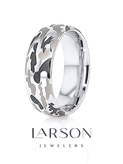 This Tungsten Carbide wedding band design by Thorsten features a laser-engraved black and gray camo pattern on its domed, polished surface and would make an exceptional wedding band for those in the military, hunters, and other outdoor enthusiasts.