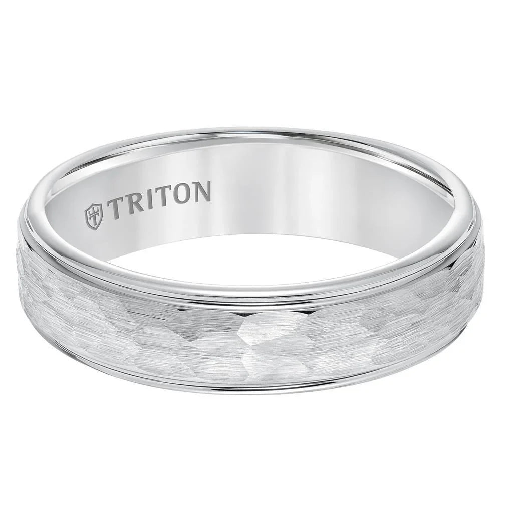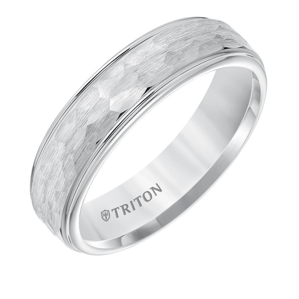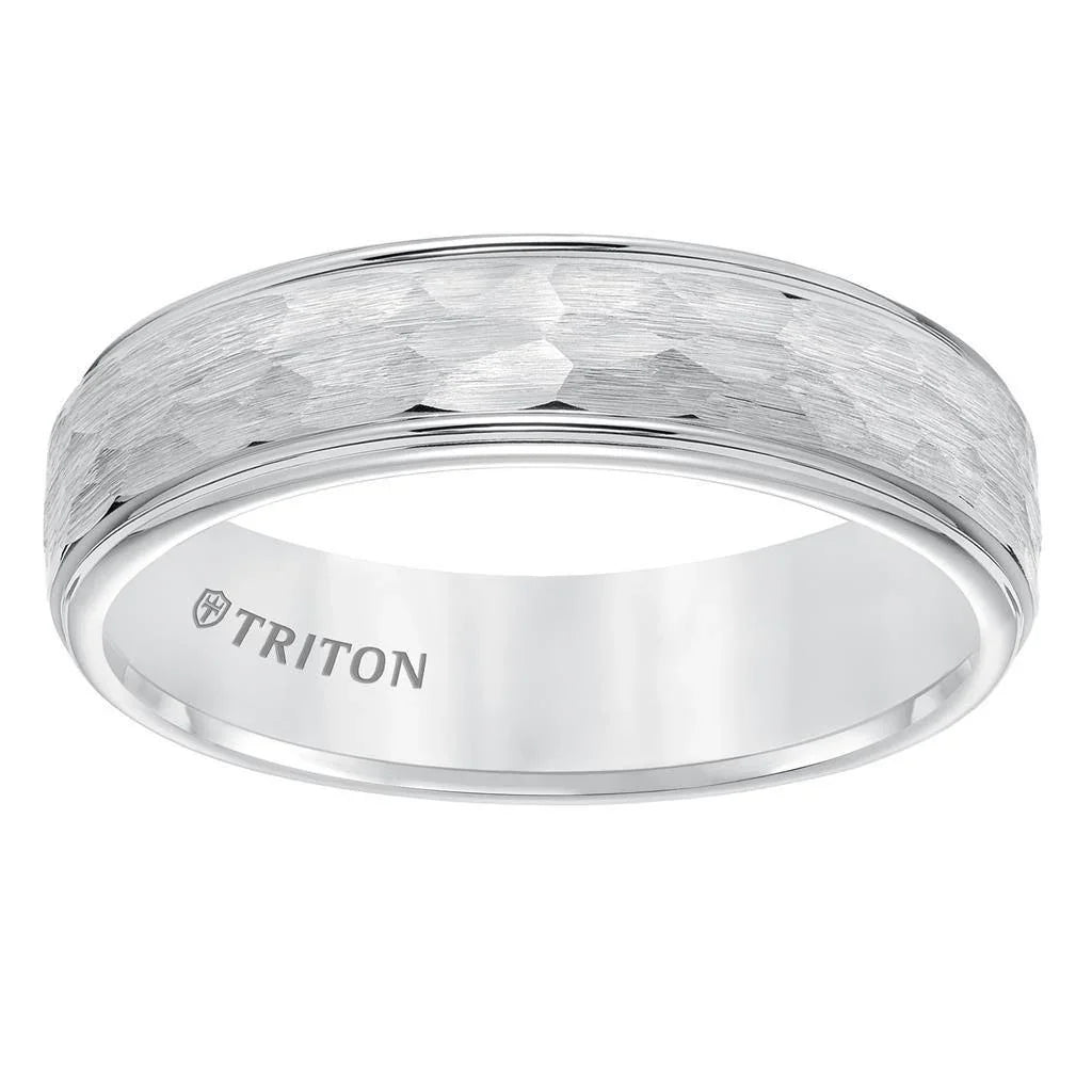 White Tungsten Carbide Step Edge Comfort Fit Band with Satin Hammer Texture by Triton Rings - 6mm