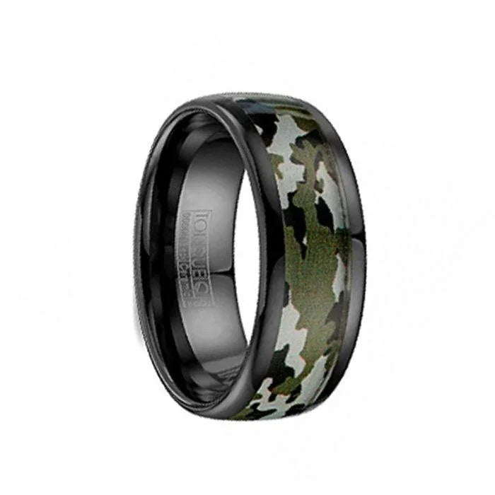 Black Ceramic Wedding Band Camo Pattern Inlay with Polished Edges - 8mm