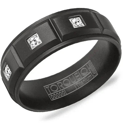 This titanium men’s wedding band has an all-black frame with the top satin-brushed to perfection. The center grooved raised center through the center, with 3 diamonds across its face. It’s the embodiment of grace. The ring comes in an 8mm width and many sizes.
