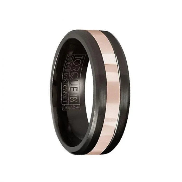 Invest in a ring that showcases your commitment as well as your defined style. Crown Ring presents this astonishing black cobalt wedding band that features a brushed finish along both sides. The center is accentuated with polished 14k rose gold inlay, adding a rich touch. This ring is available in a 7.5mm width. You can also find similar ring styles under our rose gold wedding band collection. This ring is covered by a lifetime Crown Ring warranty that covers scratching, breakage and manufacturing defects.