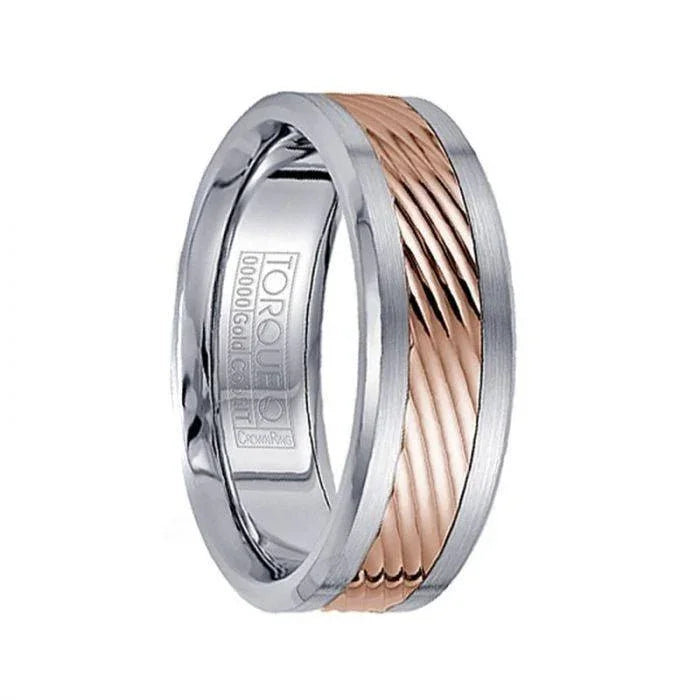 Invest in a ring as beautiful and bright as your future together with this exceptional piece by Crown Ring. A high polish finish contributes to the rich look of this white cobalt men’s wedding band. The grooved 14k rose gold center adds the perfect amount of style. This ring is also made with a rounded interior, also know as comfort fit, for ultimate wearability. It's available in a 7.5mm width. You can also find similar ring styles in our polished wedding bands collection. This ring is covered by a lifetime Crown Ring warranty that covers scratching, breakage and manufacturing defects.