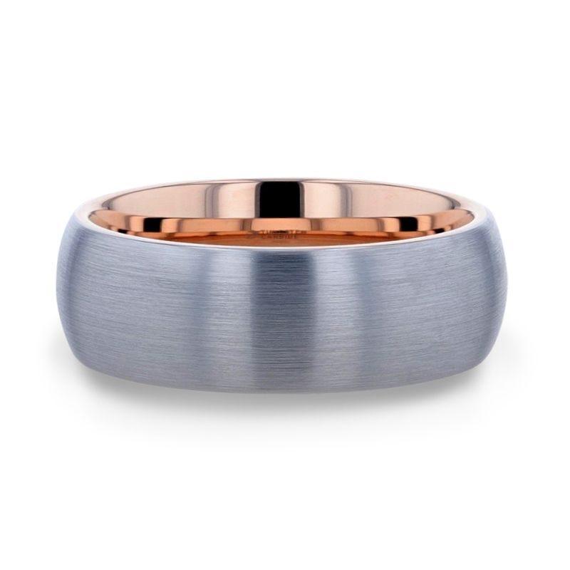 - A dome-shaped Tungsten Carbide band with a brushed top surface finish and a rose gold ion-plated interior.
