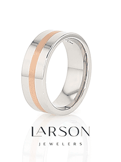 This striking ring design by Thorsten combines the beautiful gray color of Tungsten Carbide with a 2mm wide inlaid band of warm 14k Rose Gold at its center.