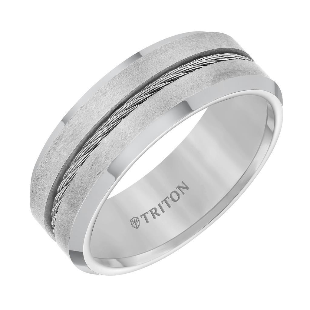 This awesome style by Triton features a stainless steel cable inlaid into the center of the ring. This ring has a unique style that features beveled edges and a brushed finish. This is the perfect wedding ring to represent your love and commitment. Larson Jewelers is proud to be an authorized dealer of Triton Rings. Triton Rings is one of the most well known and respected designers of tungsten rings in the USA.