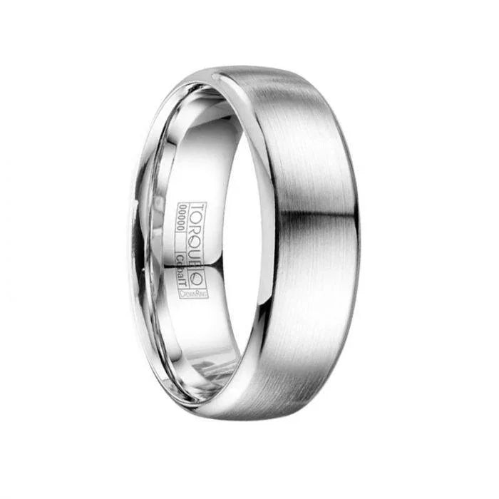 This simple yet spectacular flat ring by Crown Ring features a brushed exterior with polished edges. The inner band is rounded for a comfort fit style and is available in a 7mm width. Larson Jewelers is proud to display this ring as part of our cobalt collection. This ring is covered by a lifetime Crown Ring warranty that covers scratching, breakage and manufacturing defects.
