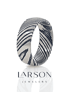 This eye-catching domed-profiled ring by Thorsten made of incredibly strong Damascus Steel features a brushed finish and distinctive blue banding patterns, the result of welding different types of steel and iron layers together intensifying its value and symbolizing the strong bond of your commitment and love.