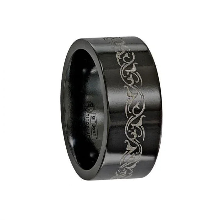 Flat Black Titanium Ring with Lasered Pattern by Edward Mirell - 10 mm This Edward Mirell ring has a stunning black polish finish on a stylish flat ring. It is made of titanium which allows it to be light but still durable and scratch resistant. The lasered pattern is captivating and gives this ring marvelous look. Larson Jewelers is proud to carry Edward Mirell jewelry, which is designed and manufactured in the USA. Edward Mirell is known for combining the latest technology and cutting edge design to create truly unique contemporary jewelry for men and women. All rings come with a certificate of authenticity and manufacturer's warranty that covers size exchanges for life, and repair or replacement in case of defective materials or workmanship. Note: There is a fee charged by Edward Mirell, not us, for all warranty work to cover processing, shipping, and handling of all warranty work.