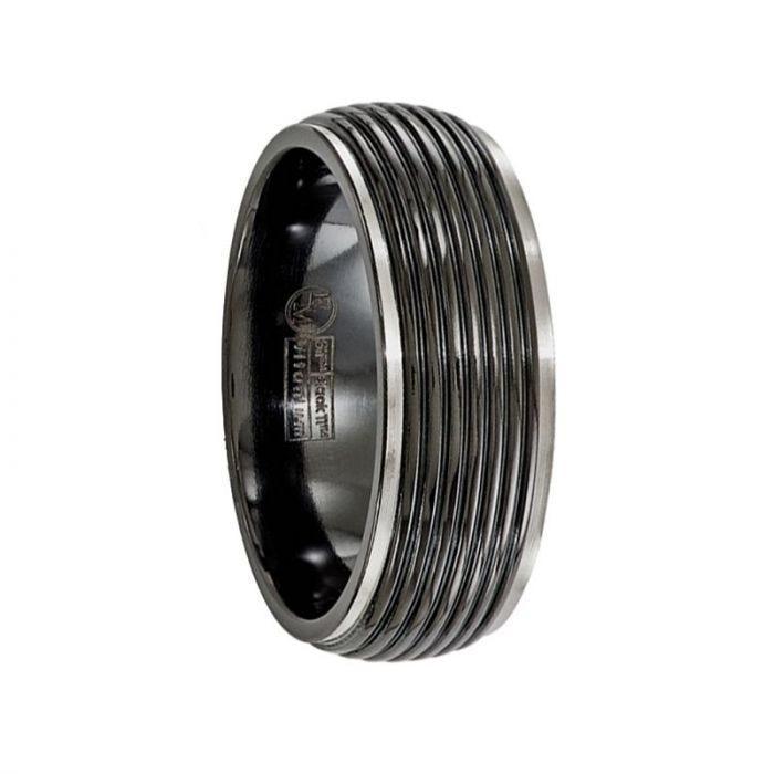 Black Titanium Ring with Grooves by Edward Mirell - 8 mm This Edward Mirell ring has a spectacular design on a contemporary domed style ring. It is made of titanium which allows it to be light but still durable and scratch resistant. The multiple black grooves are impressive and create a marvelous appearance on the ring. Larson Jewelers is proud to carry Edward Mirell jewelry, which is designed and manufactured in the USA. Edward Mirell is known for combining the latest technology and cutting edge design to create truly unique contemporary jewelry for men and women. All rings come with a certificate of authenticity and manufacturer's warranty that covers size exchanges for life, and repair or replacement in case of defective materials or workmanship. Note: There is a fee charged by Edward Mirell, not us, for all warranty work to cover processing, shipping, and handling of all warranty work.