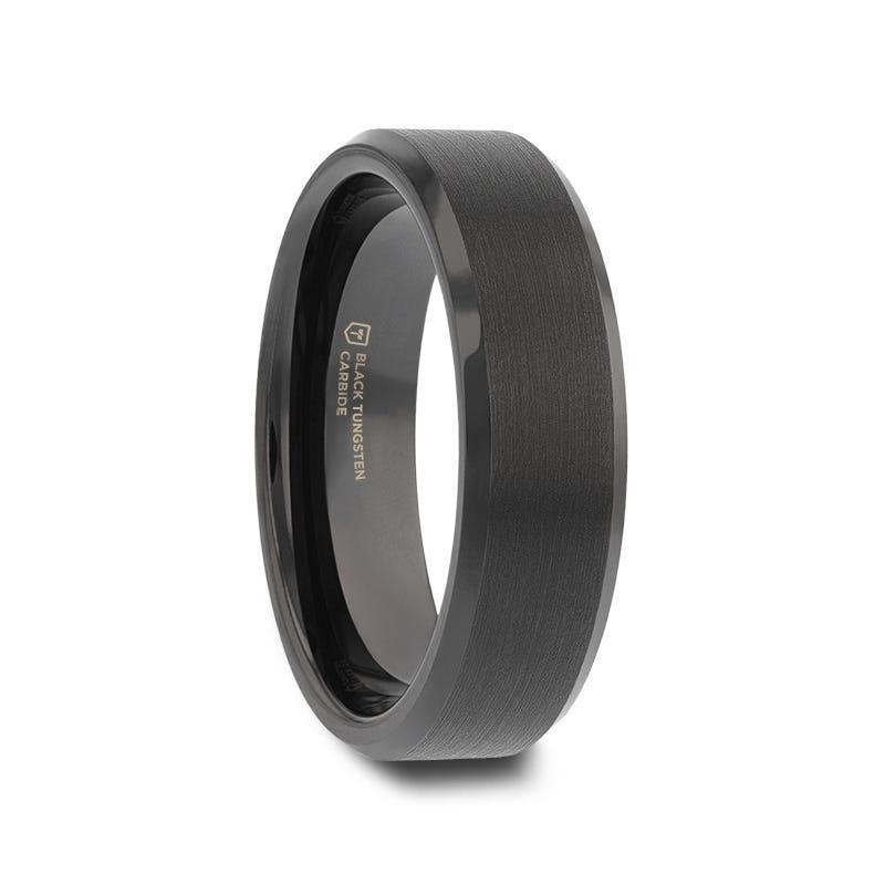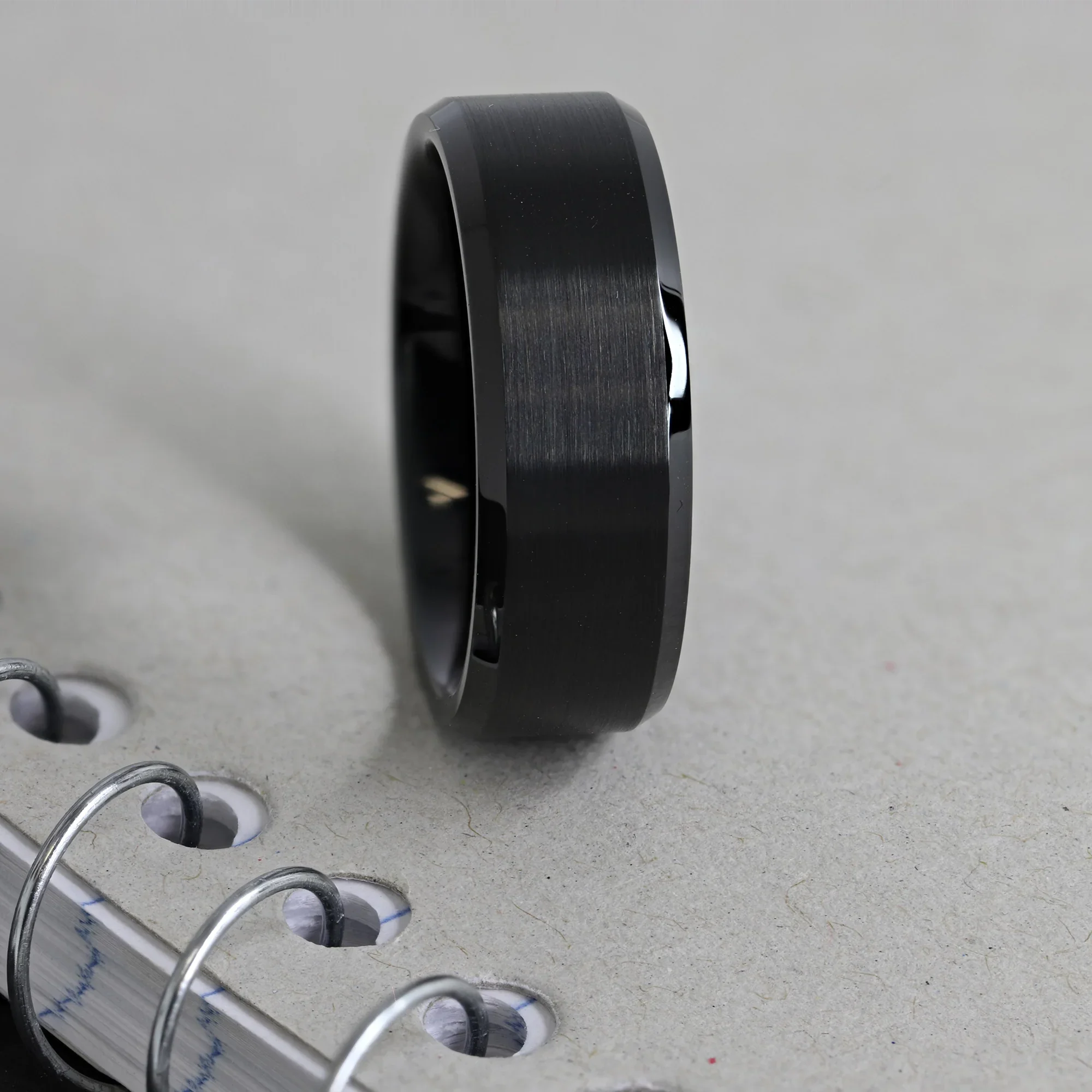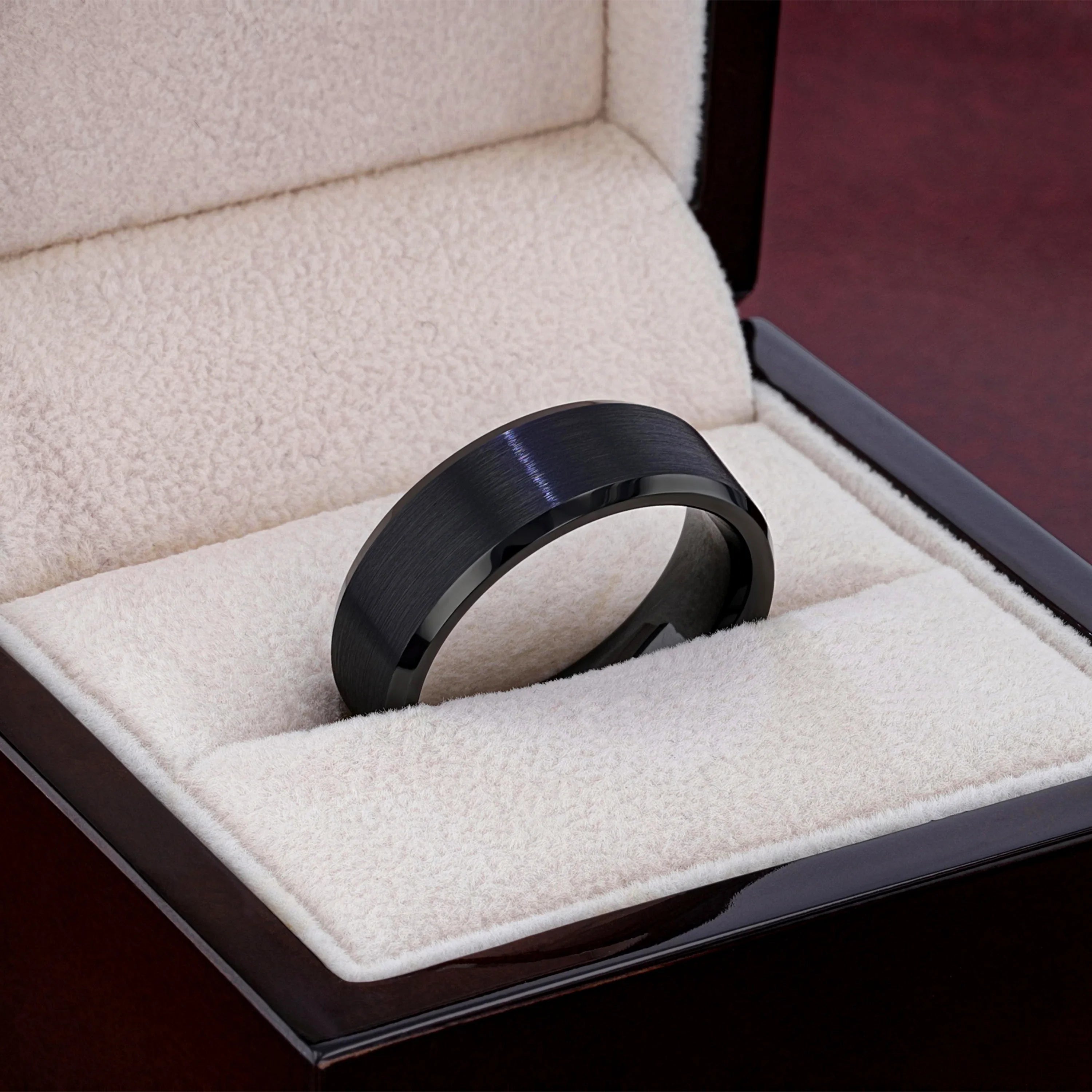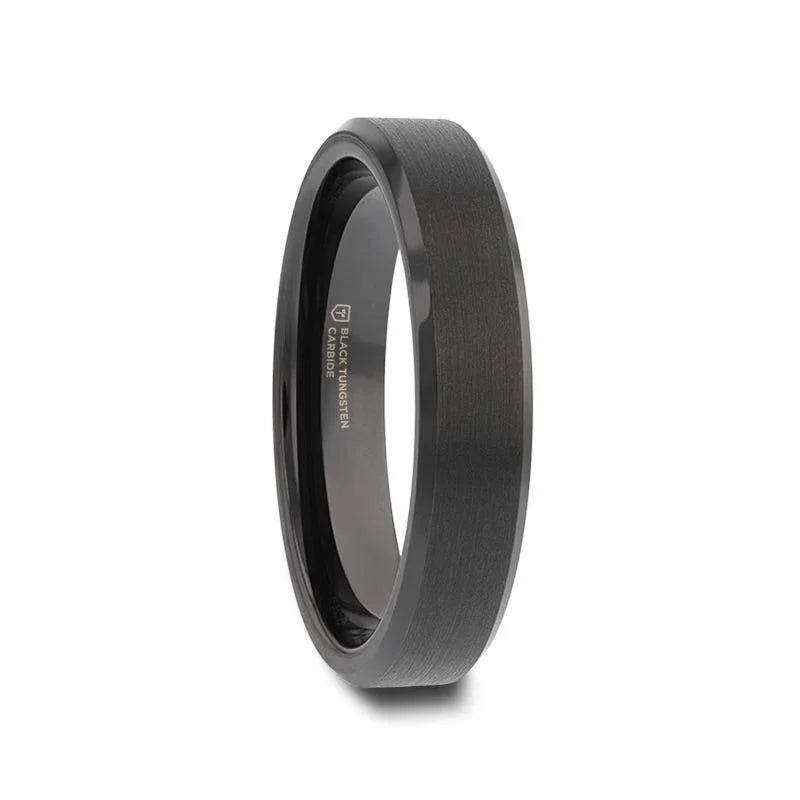 ELISE Black Tungsten Ring with Brushed Center and Polished Beveled Edges, 4mm–10mm