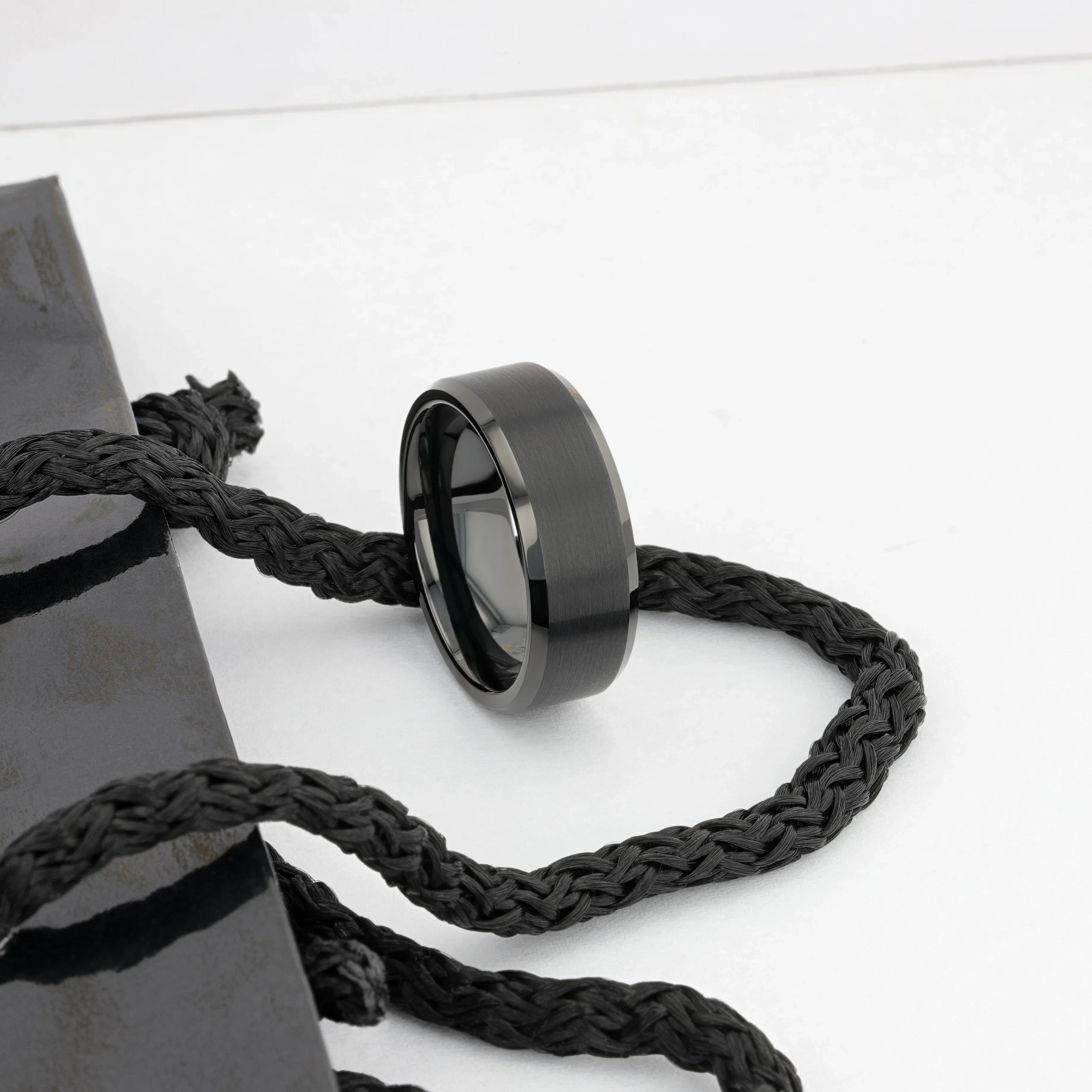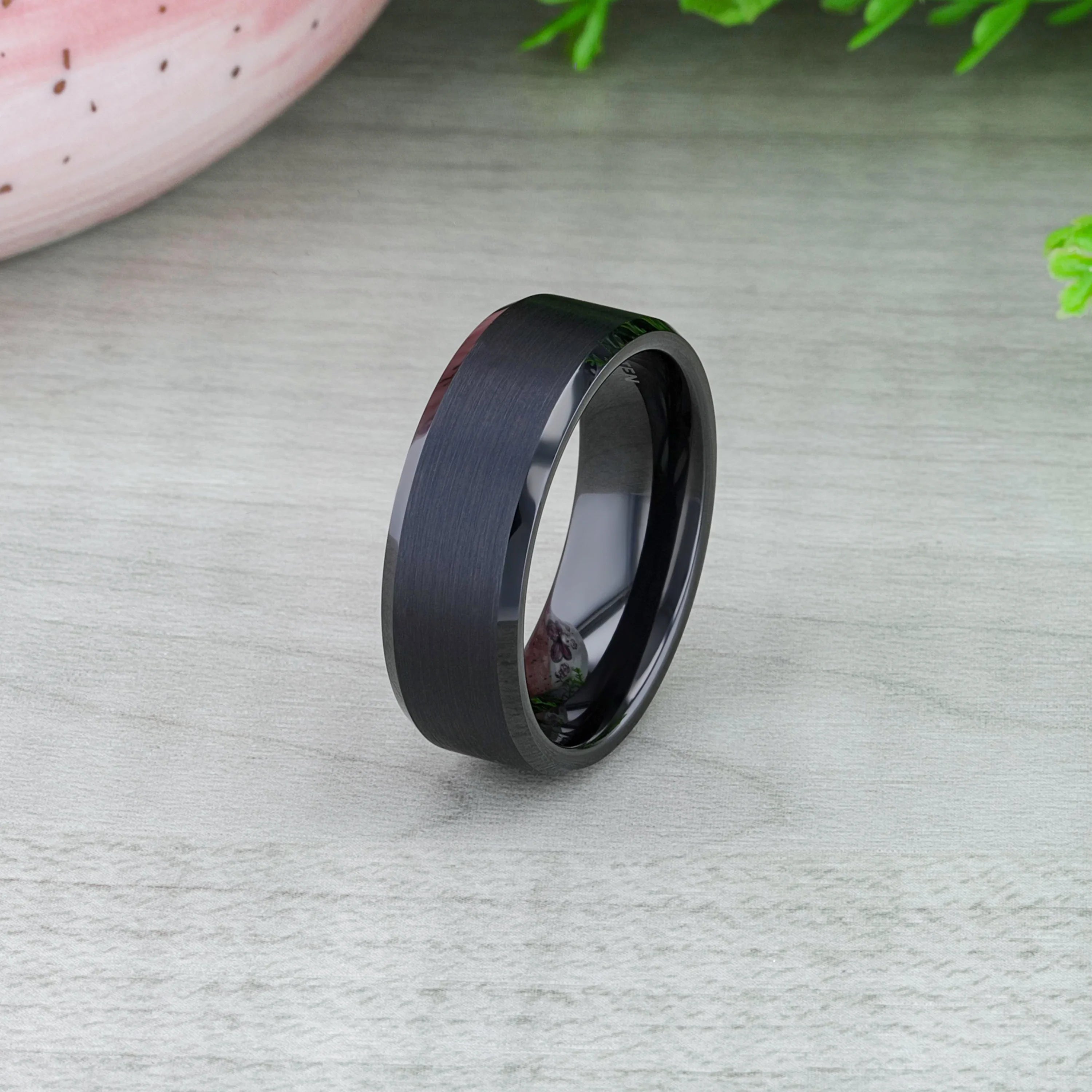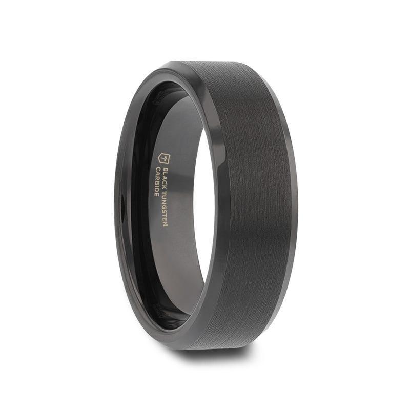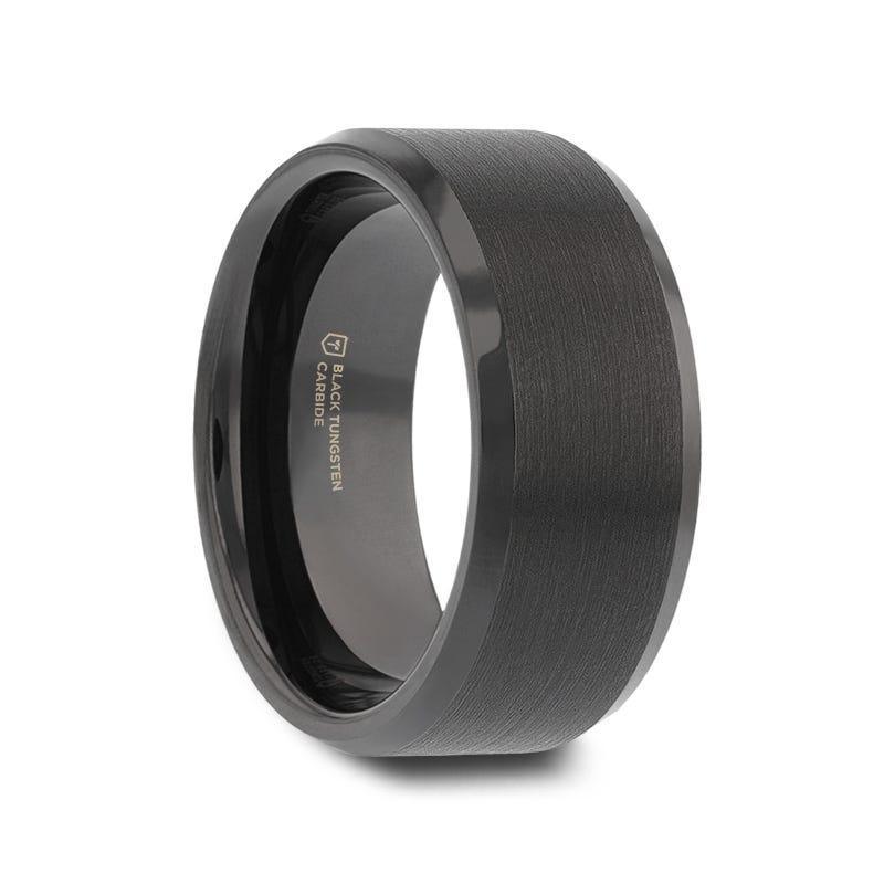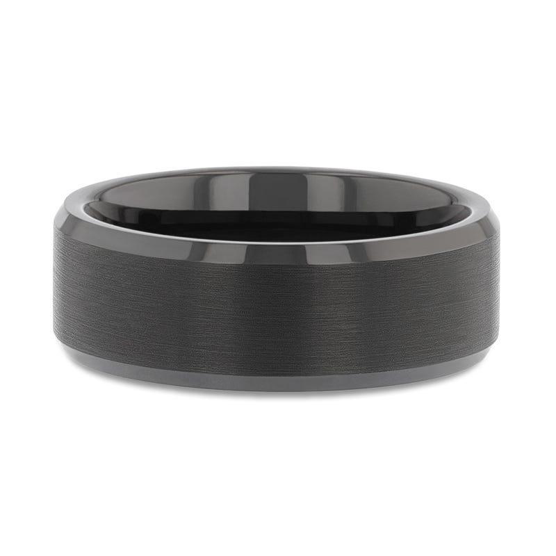 ELISE Black Tungsten Ring with Brushed Center and Polished Beveled Edges, 4mm–10mm
