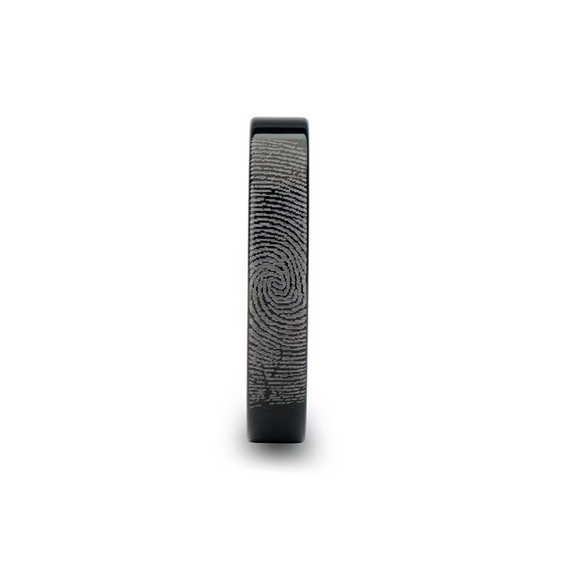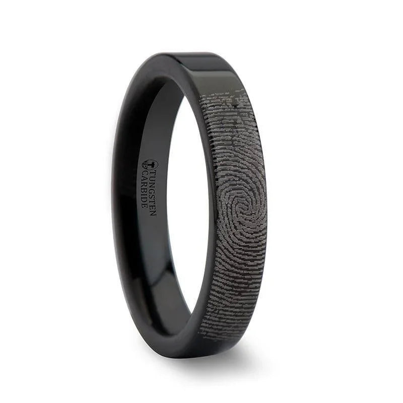 Fingerprint Engraved Flat Pipe Cut Black Tungsten Ring Polished - 4mm - 12mm