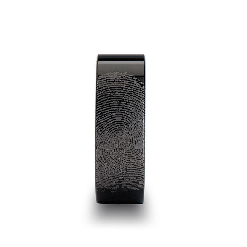 Customize this precision crafted ring from our line of Comfort Fit Black Tungsten Carbide Rings with a fingerprint of you, or your loved one. Fingerprints can be engraved on the inside or outside of this band, all fingerprints are engraved on the outside of the band unless specifically stated in your order notes.