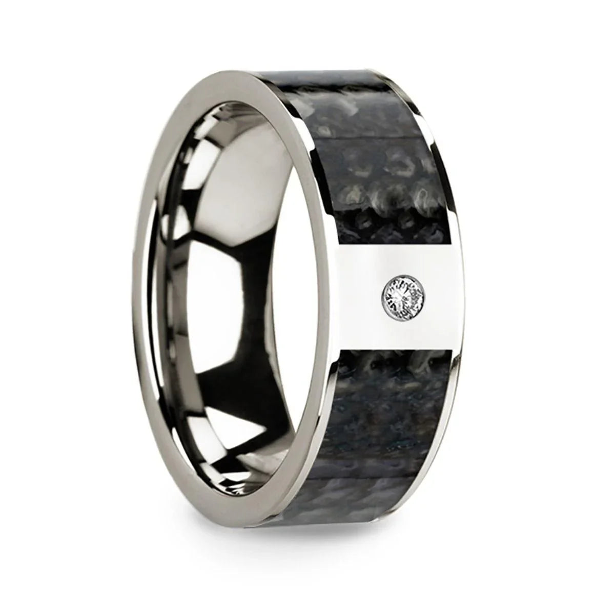 Flat 14k White Gold with Blue Dinosaur Bone Inlay and White Diamond Setting - 8mm