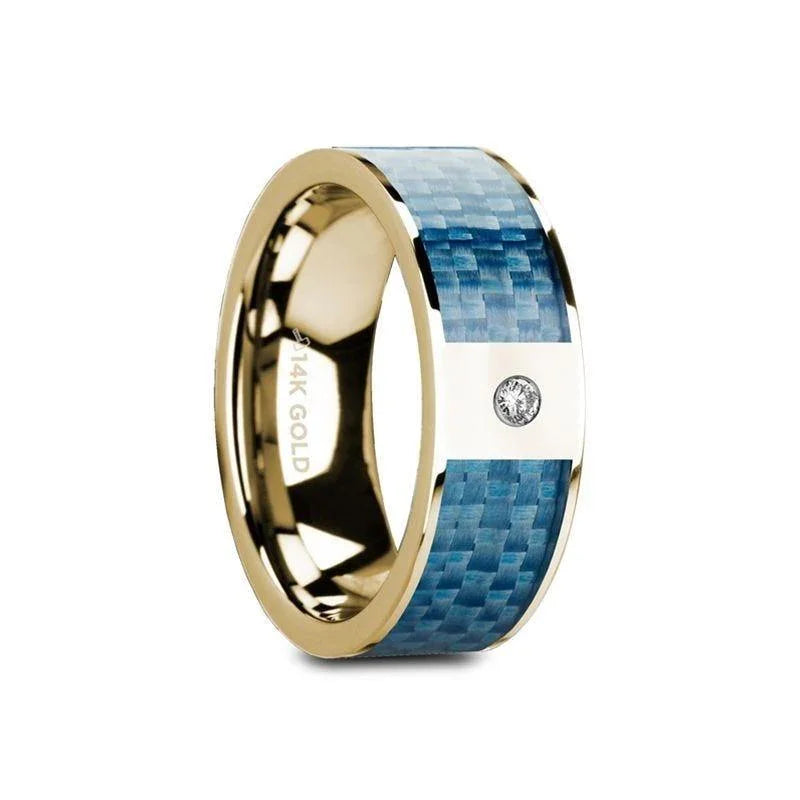 GILES Flat 14K Yellow Gold with Blue Carbon Fiber Inlay and White Diamond Setting - 8mm