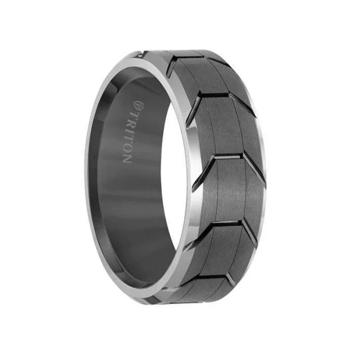 JAGGER Grey Tungsten Wedding Ring with Grooved Tire Tread Pattern & Polished Beveled Edges by Triton Rings - 8mm