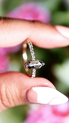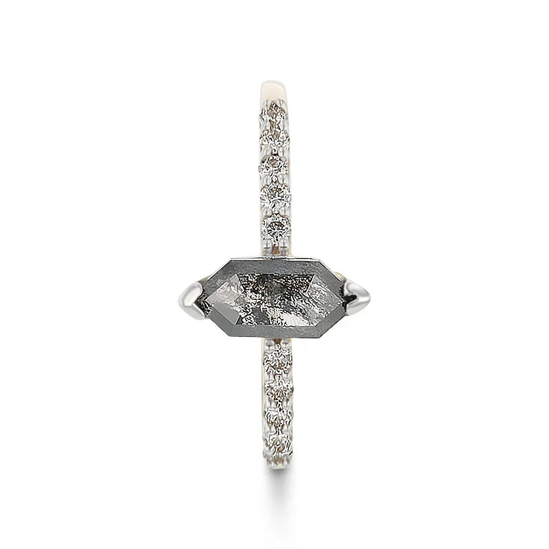 At the heart of this exquisite piece rests a mesmerizing 0.91 carat marquise-cut Salt & Pepper Diamond, renowned for its distinctive beauty and character. Each Salt & Pepper Diamond is a one-of-a-kind masterpiece, with its own fascinating inclusions and patterns that tell a story as unique as your own.