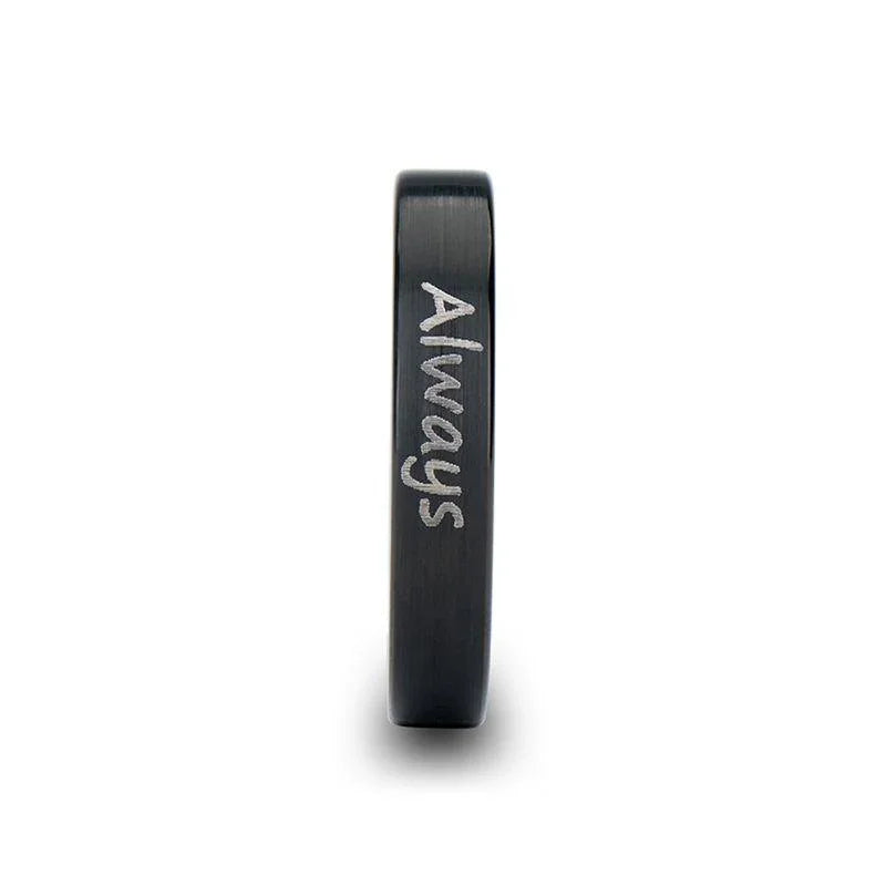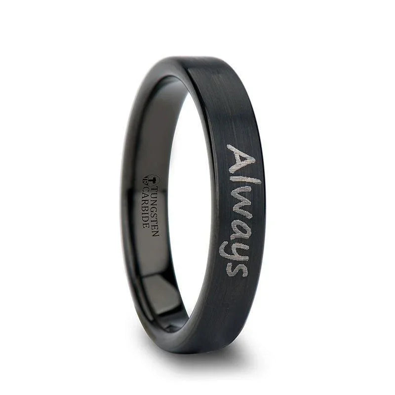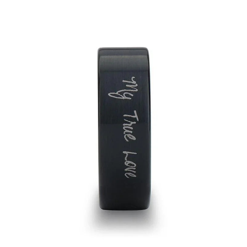Handwritten Engraved Flat Pipe Cut Black Tungsten Ring Brushed - 4mm - 12mm